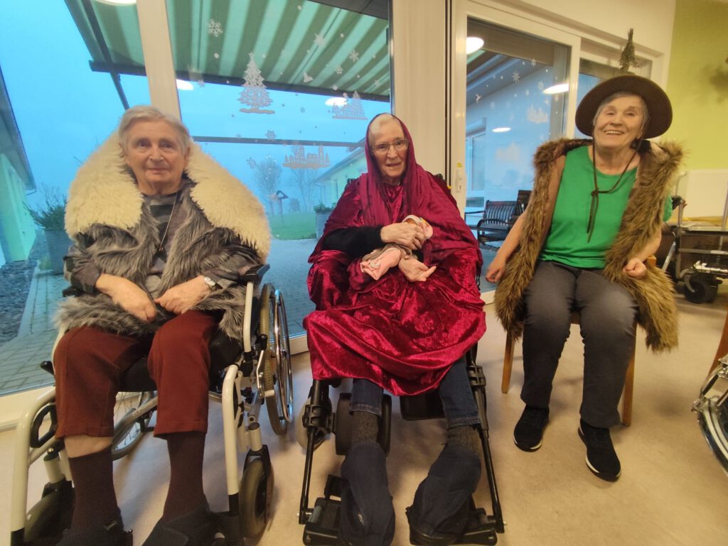 Ein ganz besonderes Highlight war die Aufführung der Weihnachtsgeschichte im Seniorenheim Rhönblick. Die Geschichte wurde nicht nur vorgelesen, sondern gespielt, gesungen und vorgetragen – mit liebevollen Verkleidungen und großem Engagement. Viele Seniorinnen und Senioren waren aktiv beteiligt, sangen mit, sprachen Texte oder verfolgten die Aufführung mit sichtbarer Begeisterung.